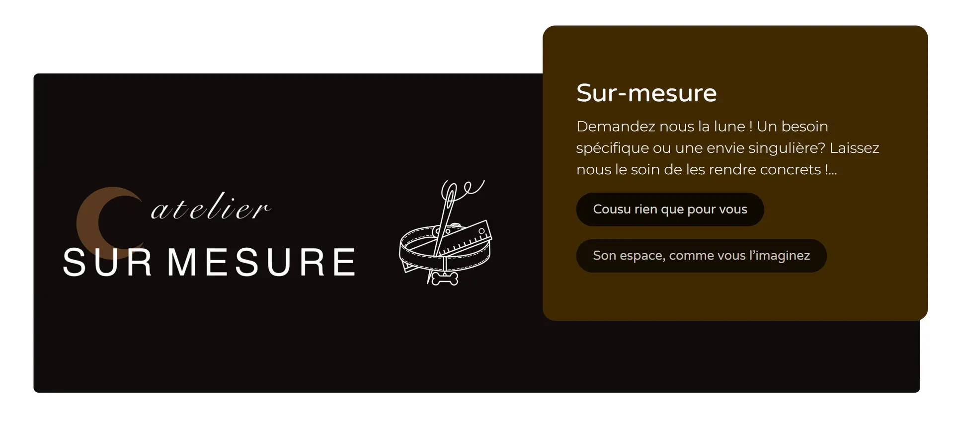 Nous concevons et créons des meubles personnalisés adaptés à vos besoins uniques. Notre équipe travaille avec vous pour s'assurer que chaque pièce s'intègre parfaitement à votre espace et à votre style de vie.